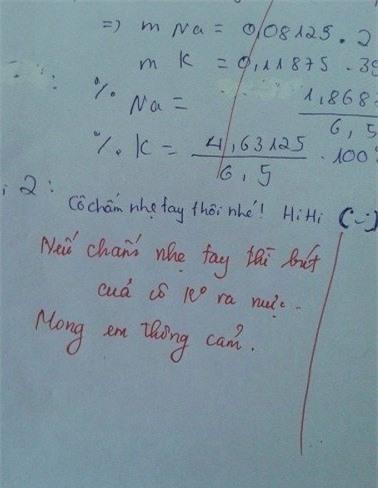 Trong bài kiểm tra, học sinh viết: “Cô chấm nhẹ tay thôi nhé. Hi hi”. Cô giáo có lời phê như sau: “Nếu chấm nhẹ tay thì bút của cô không ra mực. Mong em thông cảm”.