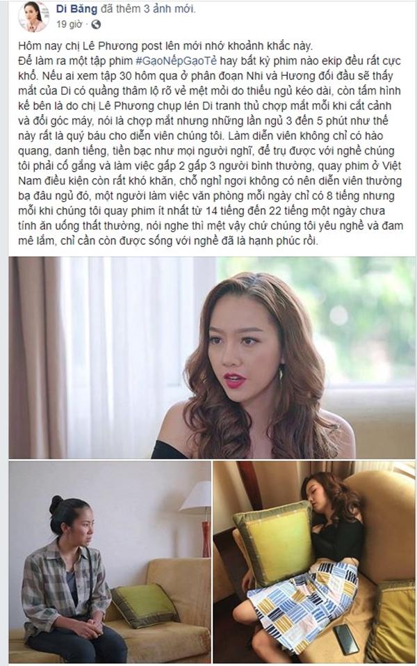 Thấy tên mình trên bức ảnh này, Băng Di đáp lại bằng 1 status: “Nếu ai xem tập 30 'Gạo Nếp Gạo Tẻ' phân đoạn Nhi và Hương đối đầu sẽ thấy mắt của Di có quầng thâm lộ rõ vẻ mệt mỏi do thiếu ngủ kéo dài, còn tấm hình kế bên là do chị Lê Phương chụp lén lúc Di tranh thủ chợp mắt mỗi khi cắt cảnh và đổi góc máy. Nói là chợp mắt nhưng những lần ngủ 3 đến 5 phút như thế này rất là quý báu cho diễn viên chúng tôi…”.