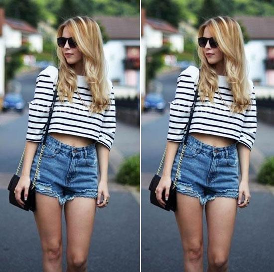 Thay vì lựa chọn một chiếc áo trơn màu, bạn hãy tự làm mới mình bằng chiếc áo kẻ sọc kết hợp quần short. Áo kẻ sọc luôn thể hiện sự ấn tượng, thời thượng, lôi cuốn và đương nhiên khi mix cùng quần short, sẽ xây dựng nên một tổng thể hoàn hảo, xinh tươi. Tùy theo vóc dáng, nếu bạn có ý định muốn tăng số đo cơ thể thì hãy lựa chọn kẻ sọc ngang, ngược lại nếu muốn tạo cái nhìn thanh mảnh thì hãy "chỉ yêu" kẻ sọc dọc.