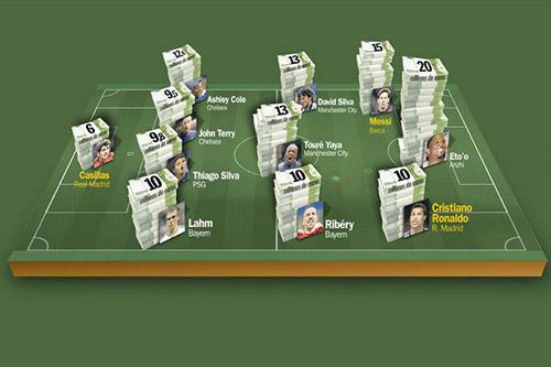 Ngoài Ronaldo, một ngôi sao khác của đội bóng Hoàng gia Tây Ban Nha là thủ thành Iker Casillas cũng có tên trong đội hình này. Thủ môn người Tây Ban Nha hiện đang nhận mức lương 6 triệu euro/mùa tại sân Bernabeu.