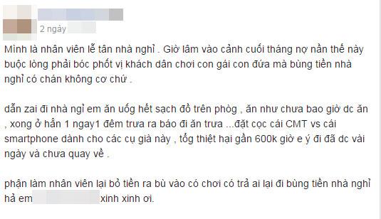 H. chia sẻ: "Mình là nhân viên lễ tân nhà nghỉ. Giờ lâm vào cảnh cuối tháng nợ nần thế này buộc lòng phải bóc phốt vị khách dân chơi. Con gái con lứa mà bùng tiền nhà nghỉ có chán không cơ chứ. Dẫn giai đi nhà nghỉ em ăn uống hết sạch đồ trên phòng, ăn như chưa bao giờ được ăn, xong ở hẳn 1 ngày 1 đêm, trưa ra báo đi ăn trưa... đặt cọc cái chứng minh thư với cái smartphone dành cho các cụ già này, tổng thiệt hại gần 600k giờ em ý đi đã được vài ngày và chưa quay về".