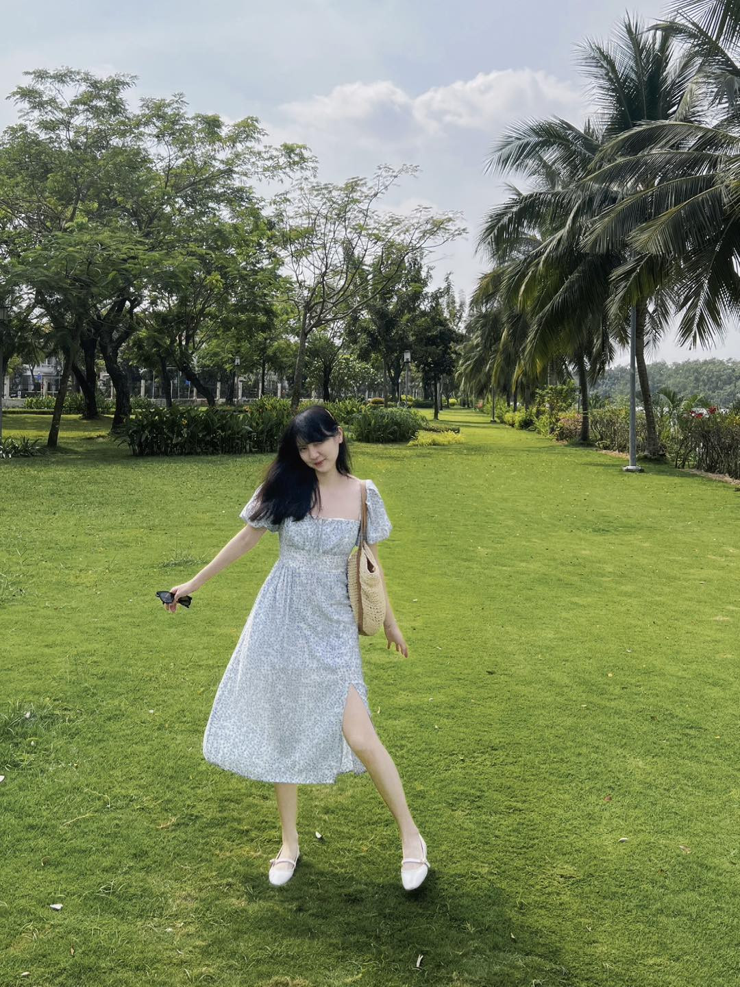 Bên cạnh phong cách năng động, Hải Tú cũng diện các trang phục nữ tính như váy dáng dài, tay bồng. Cô hóa thân thành “nàng thơ đích thực” khi diện váy hoa nhí màu xanh nhạt pha trắng với thiết kế cổ vuông và tay phồng nhẹ, toát lên vẻ dịu dàng, trong trẻo và đầy nữ tính.