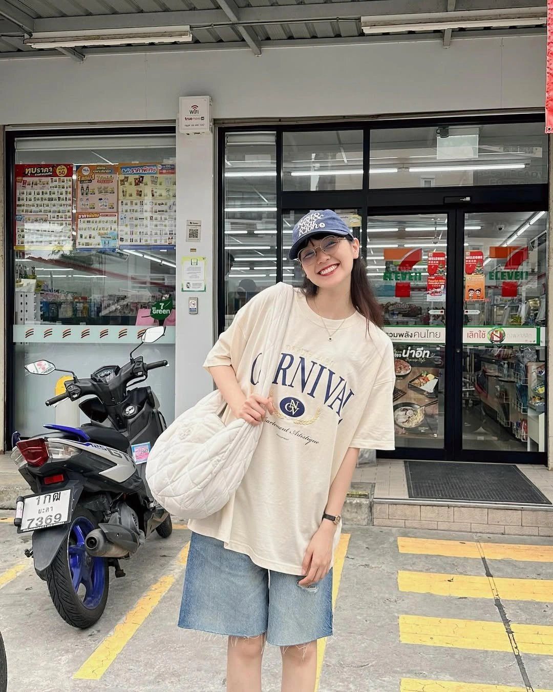 Điểm dễ nhận thấy trong gu thời trang của Hải Tú là sự tối giản. Cô thường chọn những gam màu trung tính như trắng, đen, be, ghi. Khi dạo phố, Hải Tú diện áo phông kết hợp cùng áo gile trắng, quần thun ngắn, tạo nên layer nhẹ nhàng, thoải mái.