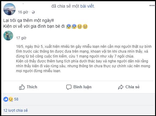 Anh Bảo Lê - thành viên của đội tìm kiếm cũng đang cập nhật liên tục tình hình tìm kiếm lên trang cá nhân của mình. Anh cho biết: ”Hiện tại vẫn chưa tìm thấy Kiện. Việc bị lạc trong rừng thì không thể nói trước  được điều gì cả. Trong quá trình tìm kiếm chúng tôi cũng thấy có rất nhiều điều bí ẩn không thể giải thích. Nay là ngày thứ 6 rồi, tình thế sẽ khá là nguy hiểm đối với một người bình thường không có khả năng đi rừng. Không loại trừ khả năng tâm linh. Nhưng chúng tôi vẫn hy vọng Kiện đang bình an ở 1 nơi nào đó và đội cứu hộ và kịp tìm thấy.