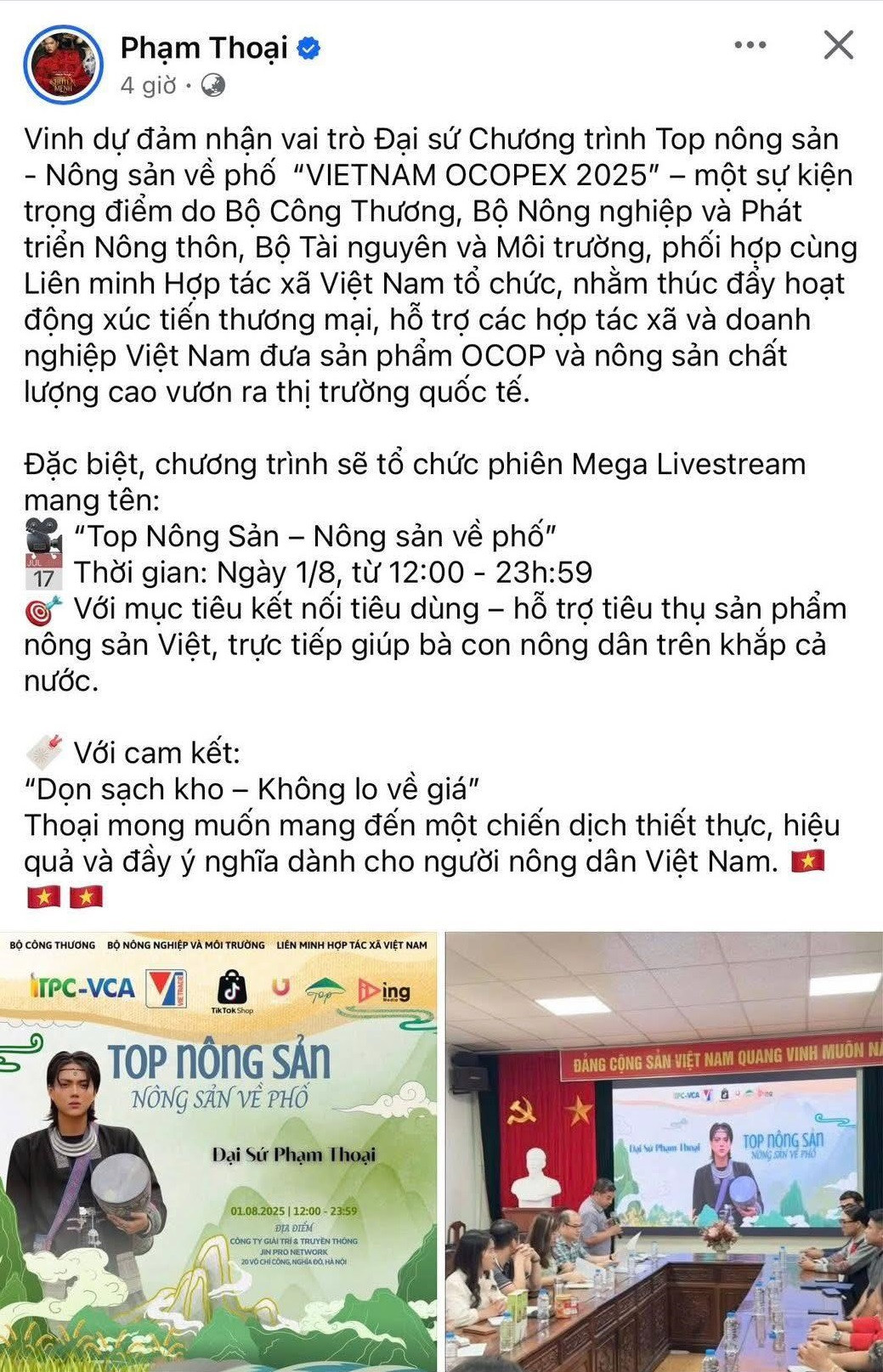 Hôm 30/7, Phạm Thoại thông báo trở lại "cuộc đua" bán hàng với phiên mega livestream được tổ chức vào ngày 1/8. Trong bài đăng trên trang fanpage có gần 900.000 người theo dõi, Phạm Thoại cho biết mình được vinh dự đảm nhận vai trò đại sứ Chương trình Top nông sản - Nông sản về phố "VIETNAM OCOPEX 2025".