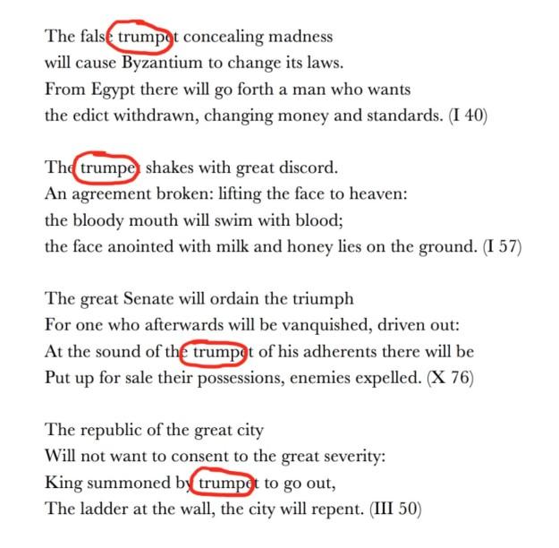 Gần đây, dân mạng chia sẻ rầm rộ những dòng thơ cổ của nhà tiên tri Nostradamus, được viết cách đây hàng trăm năm có nhắc đến "Trumpet" khiến nhiều người dự đoán Trump sẽ đắc cử Tổng thống Mỹ.