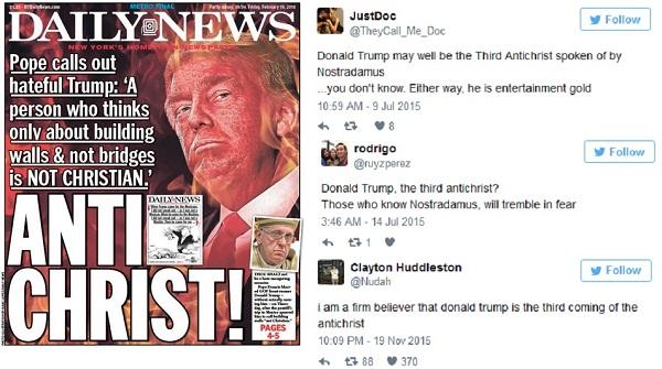 Trump cũng nổi tiếng là một Antichrist (kẻ kháng lại Jesus). Trong lịch sử loài người, Napoleon và Hitler là 2 Antichris nổi tiếng thế giới và cũng được nhà tiên tri Nostradamus tiên đoán trước đó. Đó là lý do tại sao nhiều người e ngại Donald Trump chính là Antichris thứ 3 được nhắc đến trong những vần thơ cổ của vị tiên tri này.