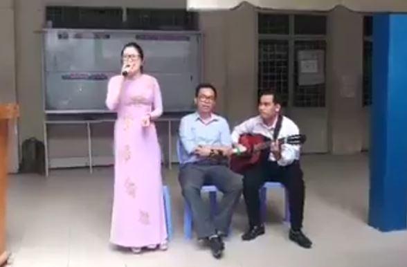Ngay sau đó, các em học sinh ngồi phía dưới đồng thanh hát theo cô giáo