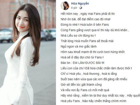 Là "thánh lầy lội" của showbiz Việt nên lời chúc tới các sĩ tử 2000 của Hòa Minzy cũng theo một cách vô cùng đặc biệt. Thay vì những dòng nhắn nhủ, Hòa Minzy làm thơ "con cóc" để gửi tới các thí sinh thi tốt. Người đẹp Bắc Ninh khẳng định: "Bao năm vừa qua các em đã cố gắng rất nhiều, giờ đã đến lúc gặt thành công".