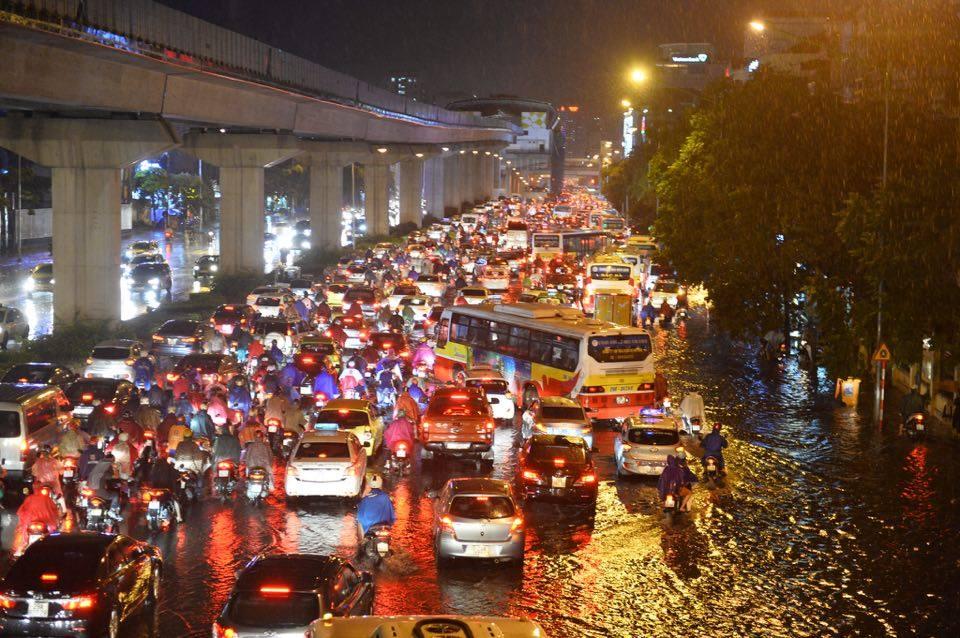 Các phương tiện giao thông chật vật di chuyển sau trận mưa lớn kéo dài gần 3 giờ đống hồ vào chiều nay.