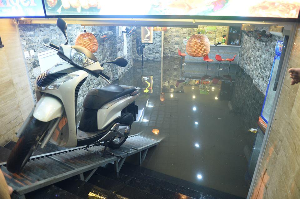 Xe máy dựng trên vỉa hè cũng phải chịu cảnh nước ngập hơn nửa bánh xe.