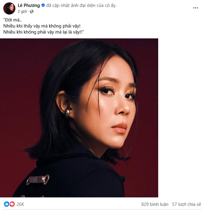 Sau đám tang Quý Bình, mới đây, Lê Phương cập nhật dòng trạng thái mới gây chú ý. Cụ thể, nữ diễn viên Gạo Nếp Gạo Tẻ cập nhật ảnh đại diện mới với diện mạo khác lạ, ánh mắt sắc sảo kèm với đó là dòng trạng thái đầy khó hiểu: "Đời mà... Nhiều khi thấy vậy mà không phải vậy! Nhiều khi không phải vậy mà lại là vậy".