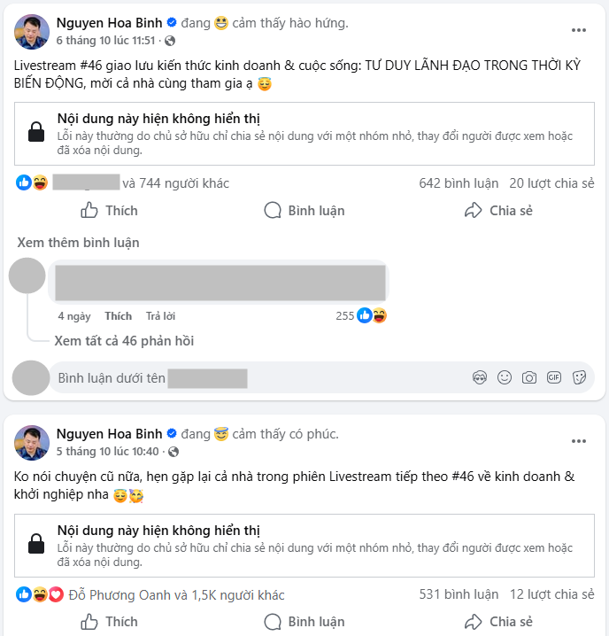 Theo đó livestream chia sẻ về chủ đề Tư duy trong thời kỳ biến động của ông xã Phương Oanh diễn ra ngày 6/10, đến thời điểm hiện tại đã "bay màu". Bởi vậy, khi người quan tâm muốn click vào xem các thông tin liên quan đều nhận về dòng chữ "Nội dung này hiện không hiển thị". Hành động này của ông khiến nhiều người khó hiểu.