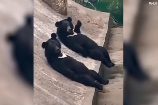 Đoạn video ghi cảnh cặp gấu nằm dài thượt trên tảng đá thư giãn, trong khi một con giơ chân lên chào khách, làm dấy lên nghi vấn người đóng giả.