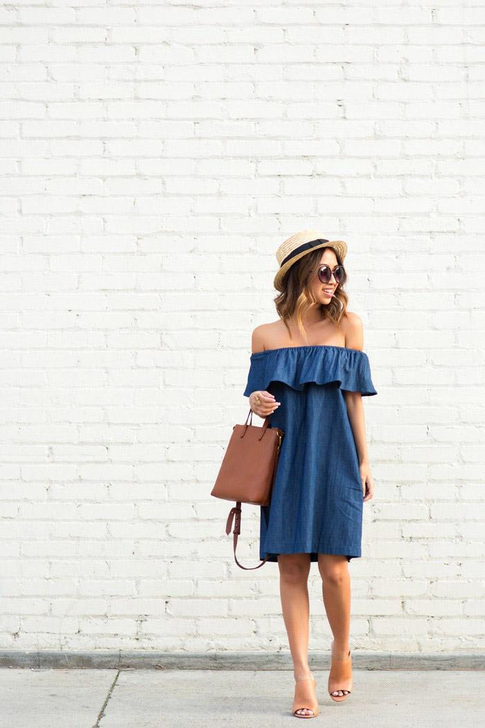 Denim bỗng chốc mềm mại và bay bổng với điểm nhấn bèo khoe vai trần.