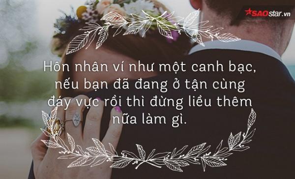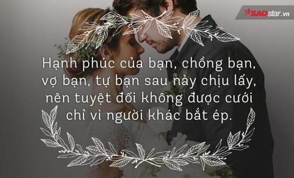 Kết hôn là một quyết định thiêng liêng, và chính vì vậy bạn không nên vội vã hoặc quá nông nổi khi đưa ra quyết định. Cuộc đời bạn có thể quyết định sai nhiều, nhưng đứng trước hôn nhân, mong bạn hãy suy nghĩ thật kĩ càng. Có những thứ đánh mất rồi sẽ không lấy lại được, danh phận trao rồi cũng sẽ thay đổi cả cuộc đời bạn. Vì vậy, đừng vì yếu đuối, vì bị ép uổng, vì mệt mỏi cô đơn, hay vì thù hận giận dữ mà tìm đến hôn nhân như một cứu cánh. Làm sao bạn biết được đằng sau cánh cửa ấy là phúc hay là họa? Làm gì, cũng phải chừa cho bản thân một con đường lui khả dĩ