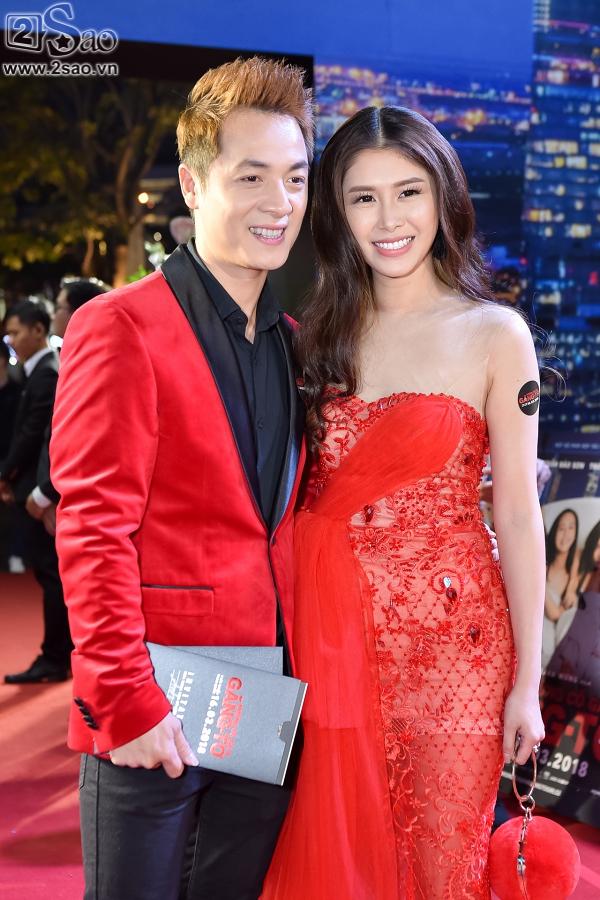 Trong khi đó vợ chồng nhà Đăng Khôi lại xúng xính váy áo đỏ rực nổi bật trên thảm đỏ