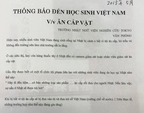 Cách đây không lâu, một số diễn đàn chia sẻ bản thông báo của Văn phòng Trường Nhật ngữ, Viện Nghiên cứu Tokyo gửi đến học sinh Việt Nam về việc trộm cắp vặt.