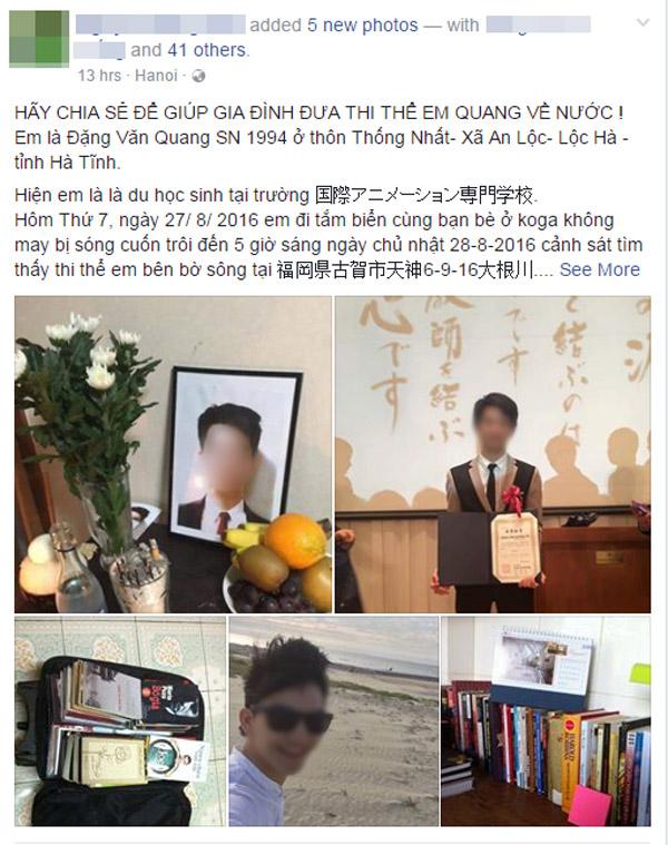 "Hãy chia sẻ để giúp gia đình đưa thi thể em Quang về nước. Hiện tại phải chờ người nhà đến xác nhận rồi mới có thể đưa thi thể em về. Giờ đây, em đã mãi ra đi nhưng nỗi đau càng trĩu nặng hơn khi bố mẹ mất con rồi nhưng họ đang ngược xuôi để đi vay tiền để có thể sang Nhật đón thi hài con về. Mong mọi người cùng chung tay san sẻ tình thương giúp em được trở về an nghỉ nơi quê mẹ".