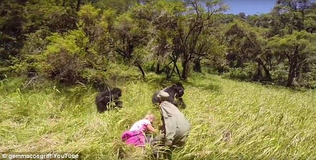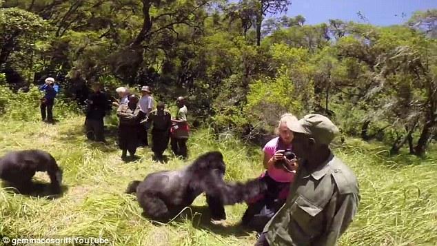 Ngay lập tức cô được sự hỗ trợ của người hướng dẫn viên để thoát khỏi chú khỉ đột