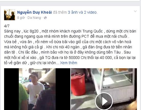 Nhạc sĩ Nguyễn Duy Khoái, hội viên Hội Nhạc sĩ Việt Nam, hiện công tác tại Chi hội Đà Nẵng chia sẻ trên trang cá nhân của mình câu chuyện do ông chứng kiến. Cụ thể, vụ việc xảy ra vào lúc 8 giờ 20 sáng cùng ngày, một nhóm khách người Trung Quốc đã gọi một chị bán chuối rong trên đường Phan Châu Trinh dừng lại để mua chuối.