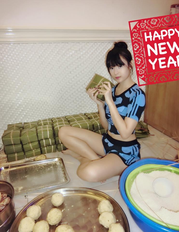 Mới đây nhất, trên trang cá nhân của mình Huyền Baby lại khiến fan "sốt sình sịch" và bạn bè khen ngợi bởi tài gói bánh chưng khéo léo. Trong ảnh Huyền Baby diện bộ đồ thể thao ngắn khỏe khoắn và tạo dáng xì tin rất đáng yêu.