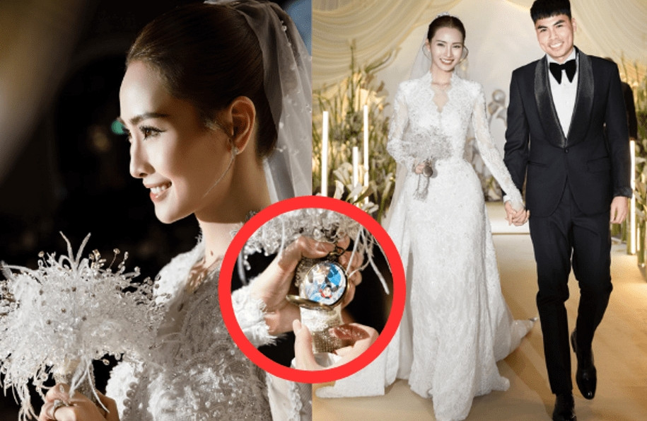 Ngay khi vừa xuất hiện, cô dâu Mù Tạt đã chiếm trọn spotlight với visual "vô thực", bộ váy cưới tinh khôi kết hợp cùng phụ kiện ngọc trai sang trọng giúp nàng MC xinh đẹp như một nữ thần. Trong khi đó, chú rể Đức Huy ghi điểm với vẻ ngoài phong độ, rạng rỡ bên cạnh người bạn đời.