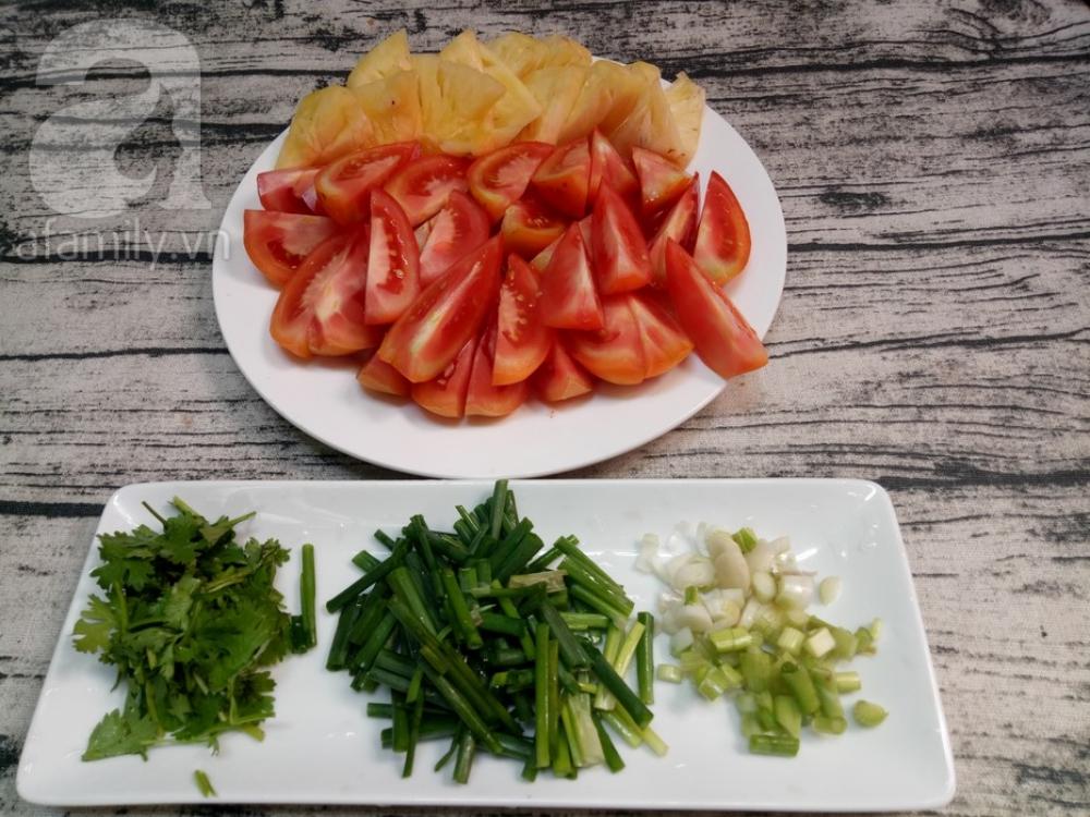 Cà chua thái múi cau, dứa thái mỏng, hành lá thái khúc.