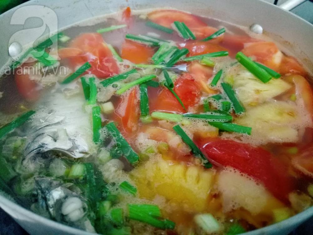 Khi nồi canh bắt đầu sôi thì cho cá vào. Khi canh sôi lên lần nữa thì cho dứa vào. Canh sôi lên lần nữa thì nêm nếm lại gia vị cho vừa ăn rồi cho hành lá và tiêu vào rồi tắt bếp.