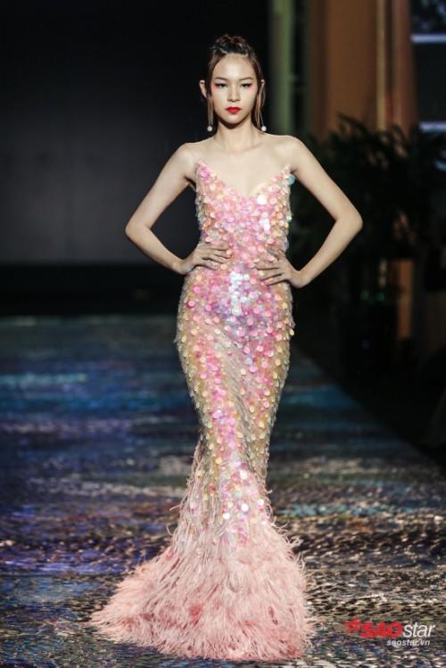 Thiết kế được đính kết từ rất nhiều hạt sequins lấp lánh gam hồng nổi bật, kết hợp cùng phần chân váy tua rua. Phom dáng đơn giản được Lê Thanh Hòa biến đổi nhằm mang đến nét gợi cảm mà vẫn vô cùng thời thượng cho phái nữ mỗi khi xuất hiện trên các sự kiện thảm đỏ.