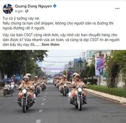 Mới đây, Nguyễn Quang Dũng đăng tải bài viết sáng tạo ý tưởng cho TP.HCM giữa thời điểm dịch bệnh căng thẳng. Theo đó, nam đạo diễn cho rằng nếu TP.HCM hạn chế shipper hoạt động, không cho người dân ra ngoài thì cảnh sát giao thông (CSGT)... sẽ rảnh hơn.