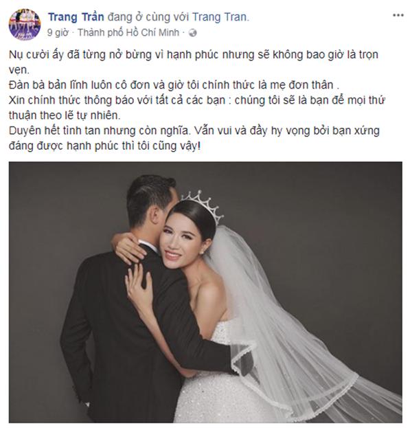 Xin chính thức thông báo với tất cả các bạn: chúng tôi sẽ là bạn để mọi thứ thuận theo lẽ tự nhiên. Duyên hết tình tan nhưng còn nghĩa. Vẫn vui và đầy hy vọng bởi bạn xứng đáng được hạnh phúc thì tôi cũng vậy!” đính kèm theo một tấm hình cựu người mẫu cười tươi như hoa trong bộ váy cưới.