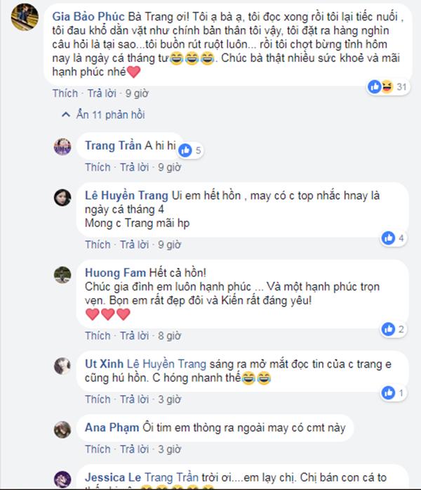 Ngay lập tức, dòng chia sẻ của Trang Trần đã nhận được sự quan tâm của người hâm mộ. Nhiều người bày tỏ sự thông cảm và nuối tiếc cho chuyện tình đẹp của cô và bạn trai. Tuy nhiên, Trang Trần đã nhanh chóng bị fan phát hiện rằng đây chỉ là một trò đùa nhân dịp cá tháng tư. Dẫu biết rằng cá tháng tư vốn là ngày nói dối cũng là dịp để bạn bè, người thân bày trò trêu chọc lẫn nhau nhưng trò đùa tinh quái lần này của cô cũng đã khiến công chúng được một phen hoảng hồn.