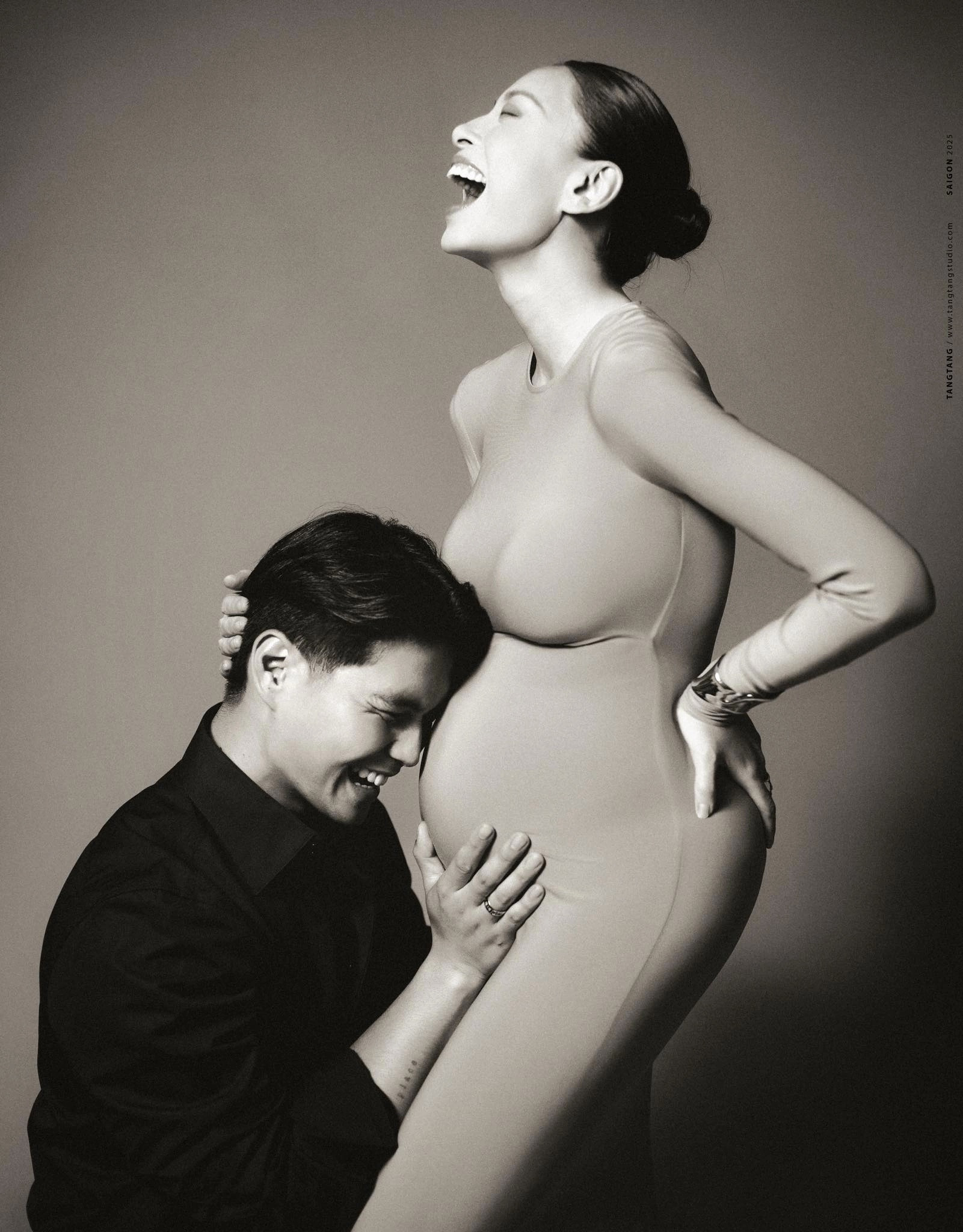 Trong hình, cô diện đầm ôm sát phô diễn bụng bầu vượt mặt cùng vòng 1 căng tràn. Ông xã cô, đầu bếp Huy Trần quỳ gối, ghé sát vào bụng vợ và âu yếm. Diễn viên nói khoảnh khắc này đã diễn đạt tất cả cảm xúc tuyệt vời của vợ chồng cô.