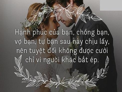 Đừng bao giờ kết hôn chỉ để bằng bạn bằng bè, để được khoác lên mình chiếc áo cưới trắng tinh khôi, hay chỉ để vui lòng bố mẹ. Cuộc sống này là của em, chính em phải là người viết những trang hạnh phúc của đời mình, cô gái ạ.