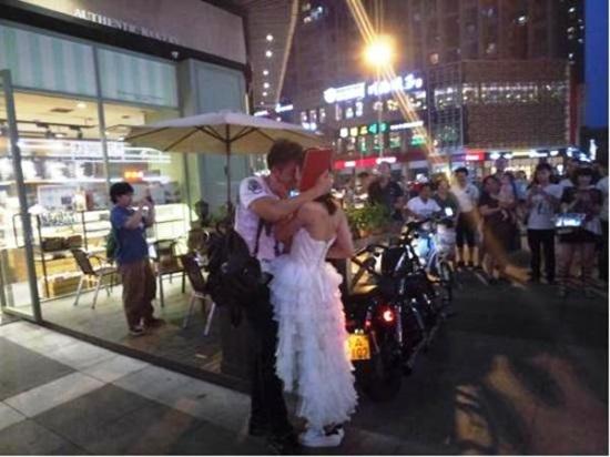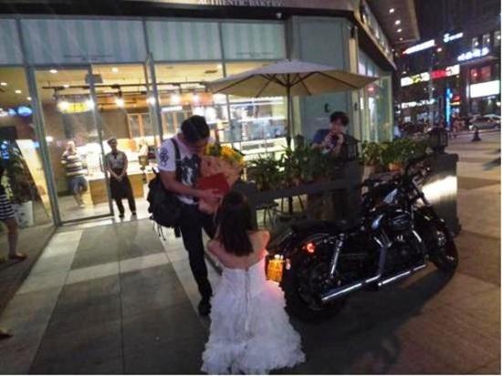 Theo đó, một cô gái xinh đẹp trong trang phục lộng lẫy, tay cầm một bó hoa lớn cùng bản sao giấy tờ nhà đất đã cưỡi chiếc xe phân khối lớn hiệu Harley Davidson tới trước cửa trung tâm mua sắm để cầu hôn với “soái ca trong mộng”.