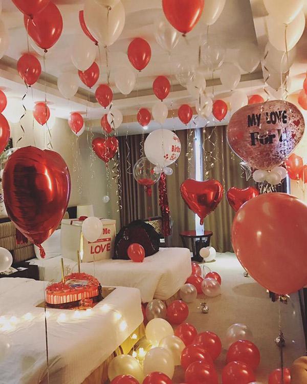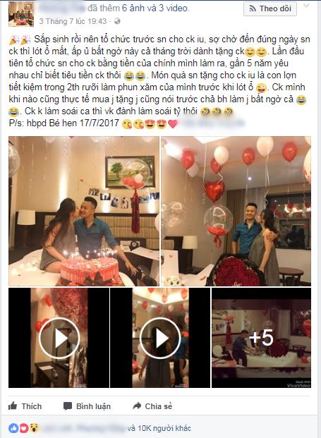 Mới đây, một cặp vợ chồng trẻ đã khiến cộng đồng mạng dậy sóng khi chia sẻ về kỷ niệm ngọt ngào của cả hai nhân dịp sinh nhật anh chồng. Cụ thể, cô nàng xinh đẹp Hương Trà đã trang trí một căn phòng toàn bóng bay, nến, hoa cùng những bức hình vô cùng lãng mạn của hai vợ chồng treo ở khắp mọi nơi. Quà Hương Trà dành tặng Đức Huỳnh - chồng cô còn là bó hoa đỏ rực hình trái tim khổng lồ, một chiếc bánh kem hình trái tim cỡ lớn, một con lợn đất bên trong chứa rất nhiều tiền mặt mệnh giá 500.000 đồng do chính Trà vừa nỗ lực làm việc vừa tiết kiệm để dành trong 2 tháng. Điều đáng nói đó là ngày sinh nhật Đức Huỳnh cũng là thời điểm Hương Trà bụng bầu vượt mặt, ngày sinh cận kề.