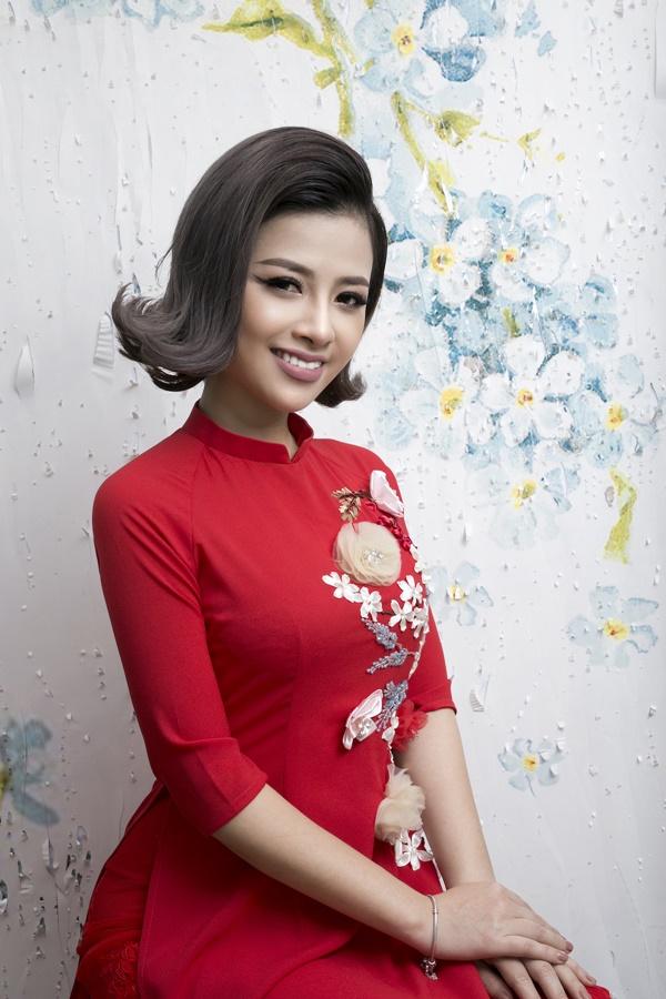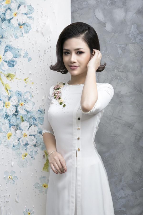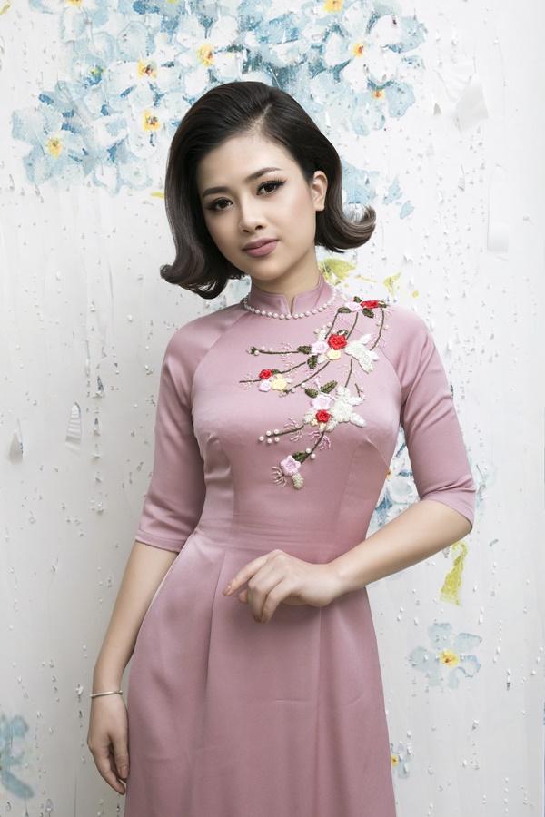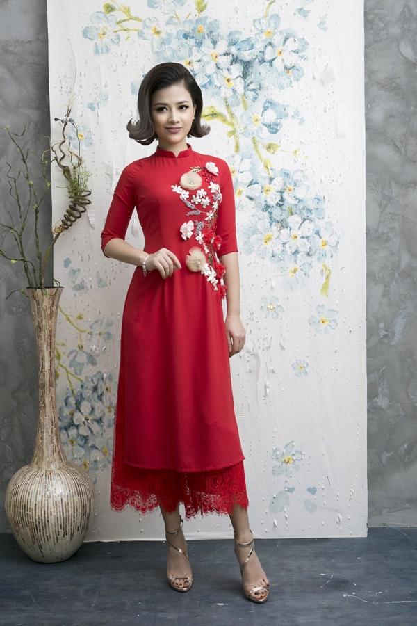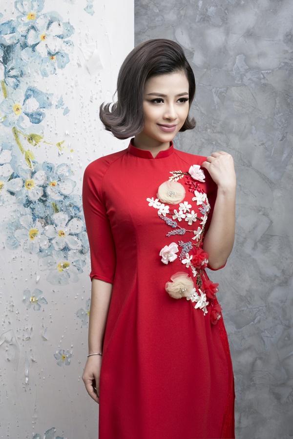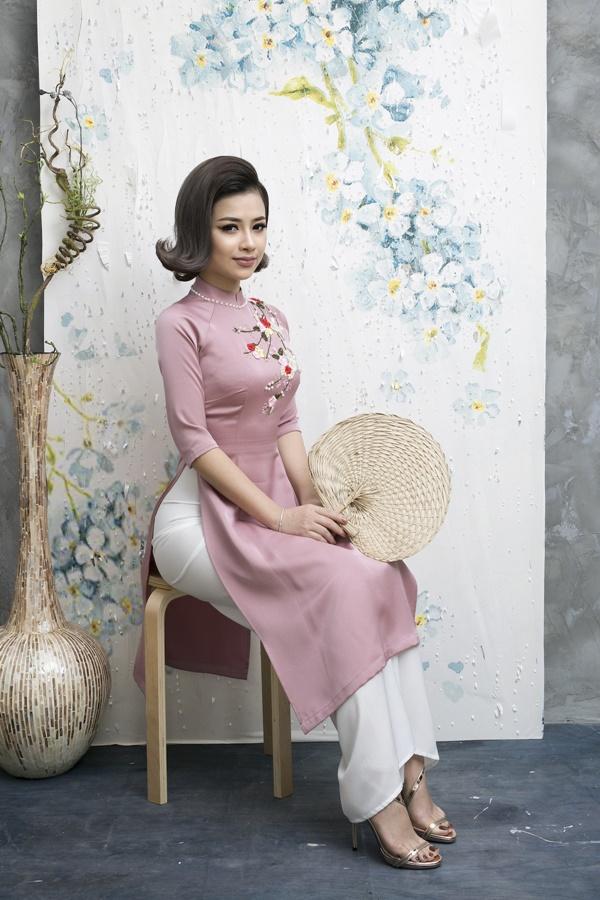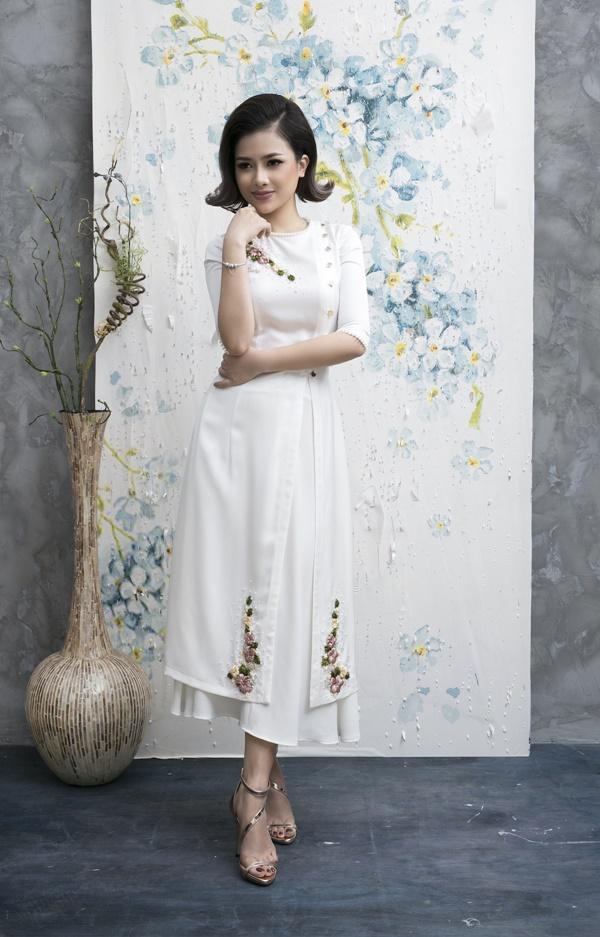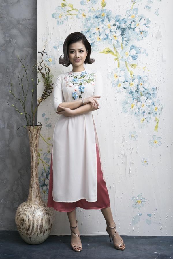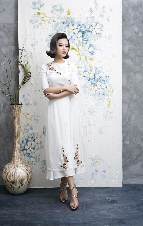 Trong bộ ảnh mới với loạt áo dài cách tân, hoạ tiết trên áo được cách điệu và thêu đính cườm hạt, ruy băng,