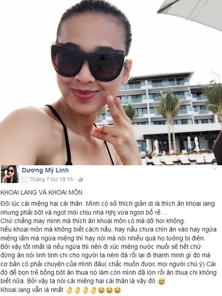 Theo đó, người đẹp họ Dương mang câu chuyện "khoai lang và khoai môn" ra để bàn luận về vấn đề "cái miệng hại cái thân" trong cuộc sống. "Khoai lang và khoai môn. Đôi lúc cái miệng hại cái thân. Mình có sở thích giản dị là thích ăn khoai lang nhưng phải bột và ngọt mới chịu, vừa ngon lại bổ rẻ. Chứ chẳng may mình mà thích ăn khoai môn có mà dở hơi không", Dương Mỹ Linh chia sẻ.
