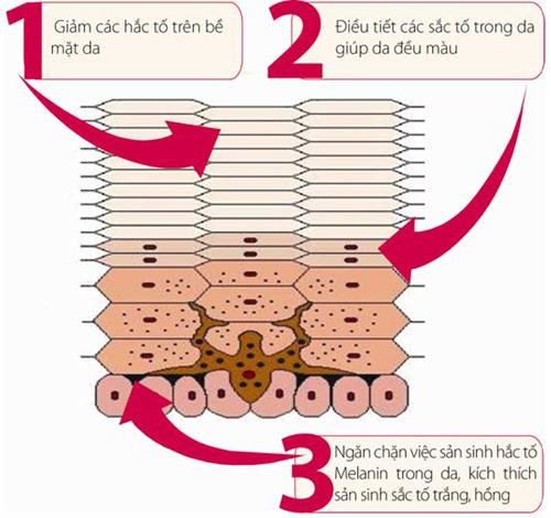 Sản phẩm cũng sẽ phân bổ lại hắc tố da trong suốt 5 tầng cấu trúc da, trên toàn bộ làn da cơ thể. Giúp làn da toàn thân đều màu và sáng dần lên. Mặt khác, da cũng sẽ được điều tiết, giảm thiểu mật độ hắc tố Melanin đen, vàng, thay thế bởi các sắc tố trắng ở những tầng cấu trúc bên trên của da (lớp bề mặt da), giúp da trở nên trắng sáng rạng rỡ.