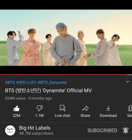 Bên cạnh đó, MV Dynamite cũng đang thu về hơn 655 triệu lượt xem, do vậy ARMY đang tranh thủ đưa đứa con này cán mốc 1 tỷ views trong thời gian nhanh nhất có thể.