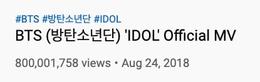 Được phát hành vào ngày 24/8/2018, MV IDOL – BTS đã chính thức cán mốc 800 triệu view vào ngày 2/12, sau 2 năm 3 tháng 8 ngày.