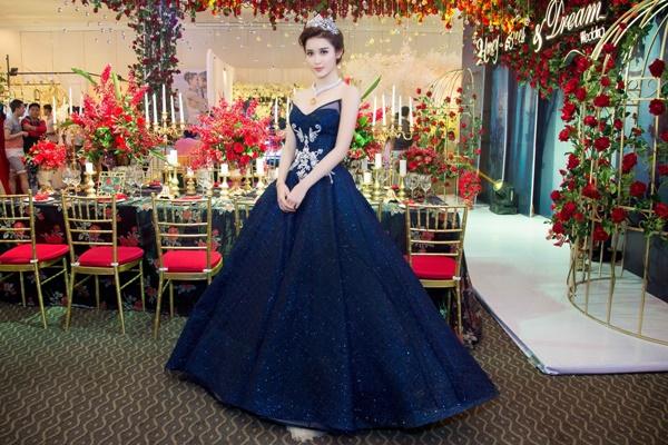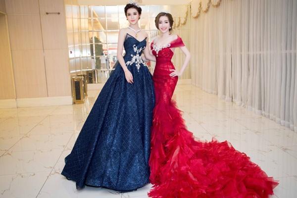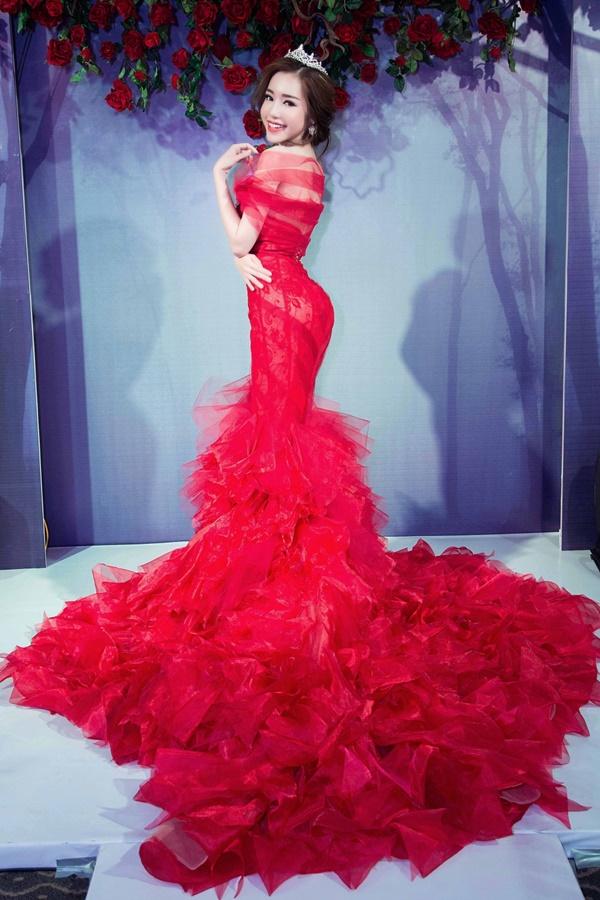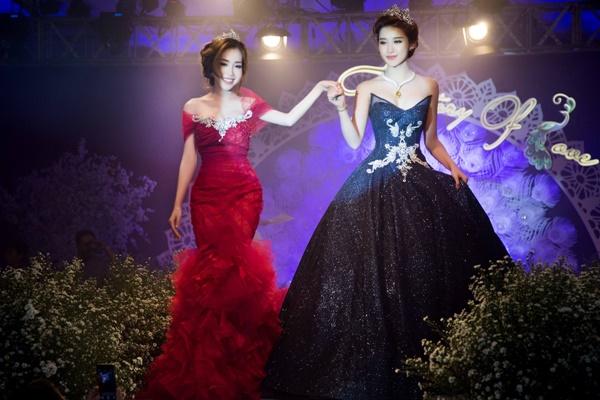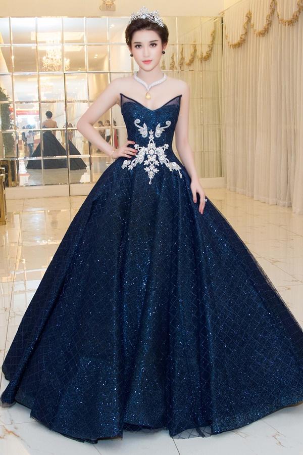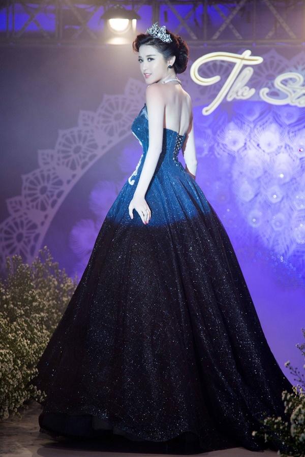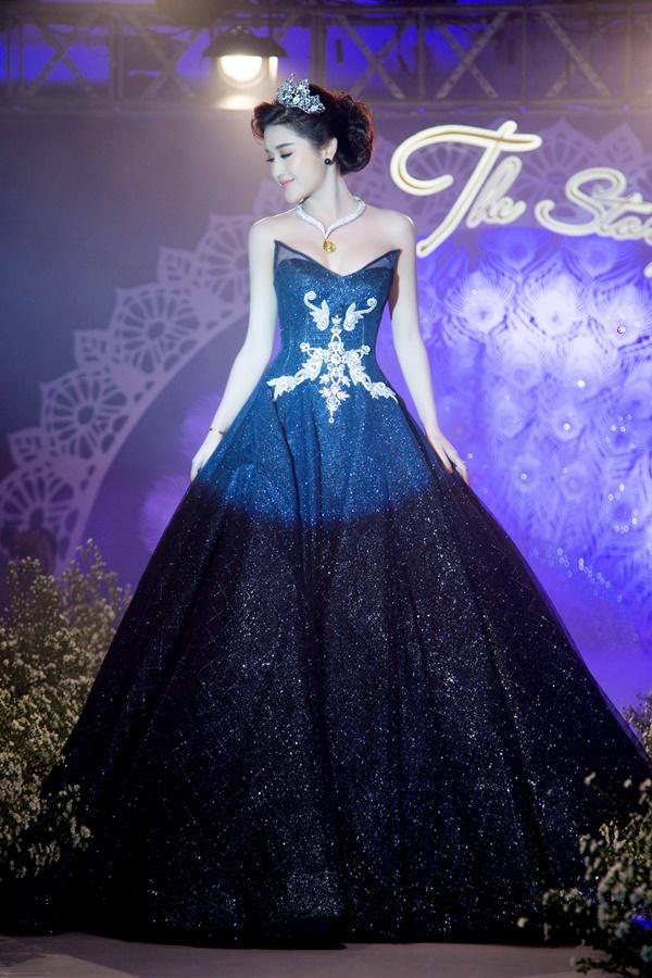 Trong khi đó, Á hậu Huyền My diện một chiếc váy dáng bồng xoè, có điểm nhấn là chi tiết đính đá lấp lánh. Chiếc váy có khối lượng đến 20kg không thể làm khó Huyền My khi được Á hậu Việt Nam xử lý một cách uyển chuyển trên sàn catwalk. Kết hợp mái tóc búi cao, trang điểm nhẹ nhàng, Huyền My trông như một nàng công chúa. Ngoài ra, Huyền My đeo trang sức tinh tế trị giá 2 tỷ đồng, giúp cô hoàn thiện ngoại hình kiêu sa.