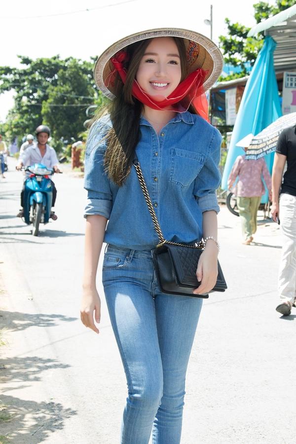 Do đoạn đường khó di chuyển bằng xe, Elly Trần quyết định đi bộ đến địa điểm tổ chức lễ trao tặng quà cho các em nhỏ và khánh thành cầu Khang Linh (tại xã Thiện Trung, huyện Cái Bè, tỉnh Tiền Giang). Hình ảnh người đẹp diện nón lá giản dị giữa đường quê thu hút sự chú ý của nhiều người đi đường.