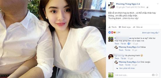 Thời gian gần đây, thỉnh thoảng Phương Trang có đăng ảnh bên một người bạn trai. Tuy nhiên cô nàng không để lộ mặt, chỉ chụp sau lưng hoặc dùng icon để che mặt người yêu. Mới đây nhất, Phương Trang cũng khéo khoe người yêu bí mật và viết: "Bất kể em thích hay không thích, có thể chấp nhận hay không , em đều phải chấp nhận. Trưởng thành chính là như vậy!"