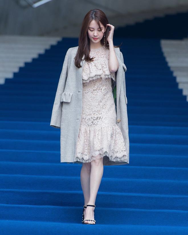 Seohuyn xuất hiện tại Tuần lễ thời trang Seoul thu đông 2018 với phong cách nữ tính nhẹ nhàng, cô chọn một thiết kế đầm ren và áo trench coat màu ghi đơn giản.