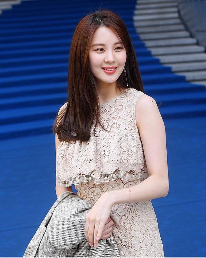 Không chỉ chọn style nữ tính có phần đơn điệu, nhan sắc của Seohuyn cũng là điều mà người hâm mộ quan tâm. Không rạng rỡ, tươi tắn như mọi ngày, gương mặt của Seohuyn nhợt nhạt, có phần kém sắc. Gương mặt cô khi cười lộ rõ dấu hiệu lão hóa, nếp nhăn ở khóe miệng, đuôi mắt. Chọn cách trang điểm đơn giản tự nhiên cùng bộ đầm màu nhạt nên nhìn Seohuyn càng nhợt nhạt hơn.