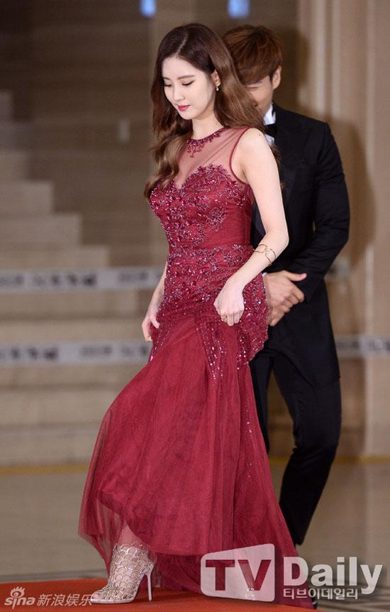 Tại đây, em út Seohyun diện bộ đầm đỏ pha ren và đính kim sa lấp lánh. Cô khoe vòng một tròn đầy lấp ló khiến công chúng "phát sốt". Đây là lần hiếm hoi người đẹp sinh năm 1991 ăn vận gợi cảm, trước đó cô thường xuyên trung thành với style kín đáo, thanh lịch.