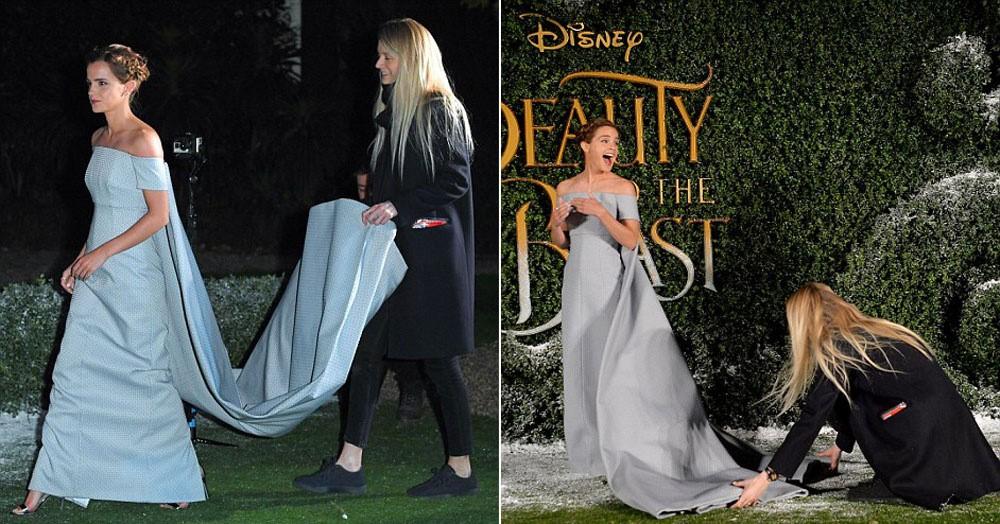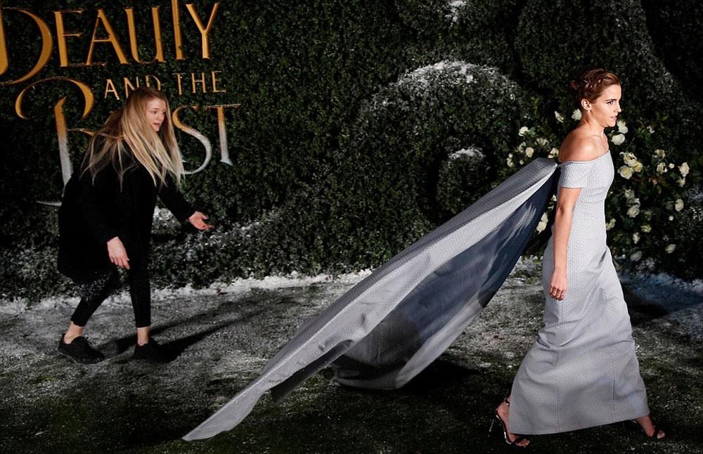 Tối 23/2 (giờ địa phương), Emma Watson xuất hiện thướt tha trong bộ đầm xanh nhạt, tóc kết vầng trăng trên thảm đỏ sự kiện chiếu ra mắt phim Beauty and the Beast (Người đẹp và Quái vật) tại London. Tuy nhiên, do váy cầu kỳ nên Emma liên tục phải nhờ đến sự hỗ trợ của trợ lý.