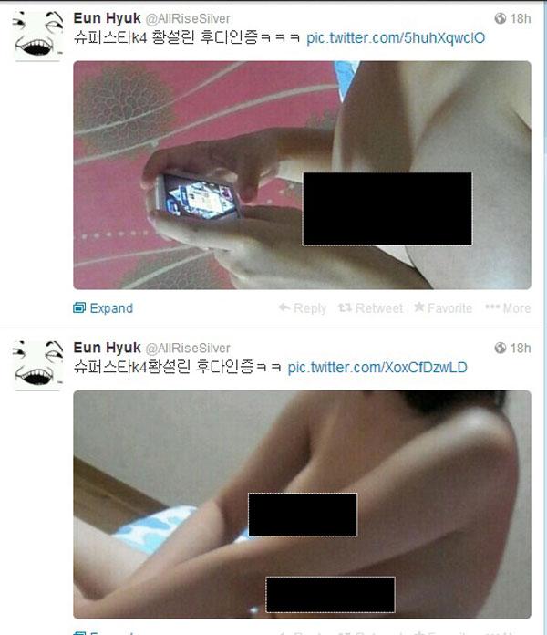 Một loạt hình ảnh phụ nữ nude vừa được đăng tải trên tài khoản twitter cá nhân của Eunhyuk (Super Junior) cách đây vài giờ cùng lời nhắn "Đây là Hwang Seol Lin của Superstar K4 kekeke". Để người xem không bị nghi ngờ, trong những hình ảnh đăng tiếp theo đó có ghi: "Đây thực sự là Hwang Seol Lin, không phải photoshop, keke".